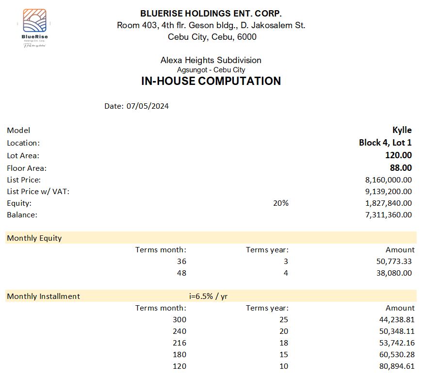 Experience a life of serenity and convenience at Alexa Heights, the pioneering project by Bluerise Holdings Ent. Corp., located in Brgy. Agsungot, Cebu City, Alexa Heights is your sanctuary, where outdoor adventures and peaceful moments coexist beautifully.