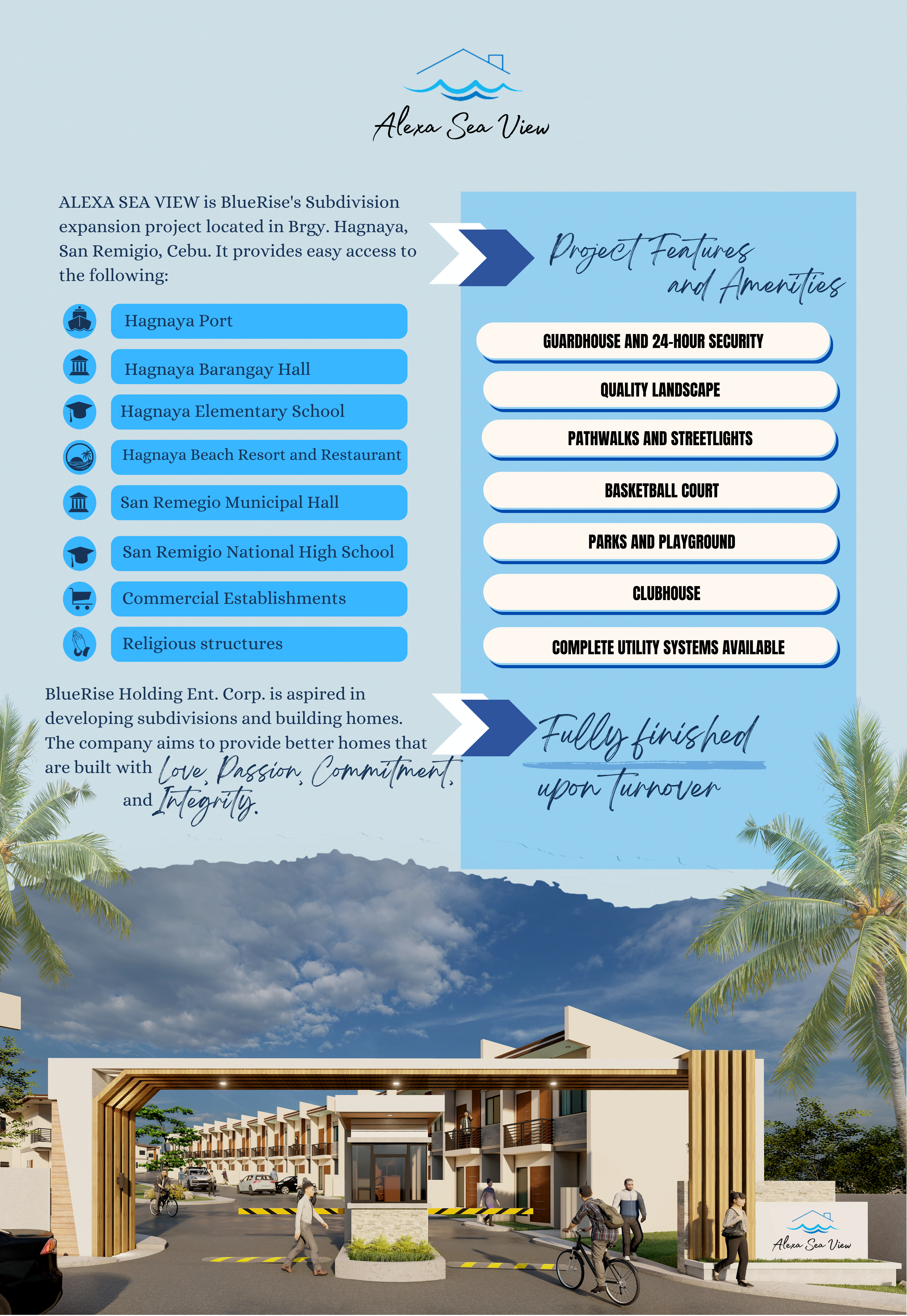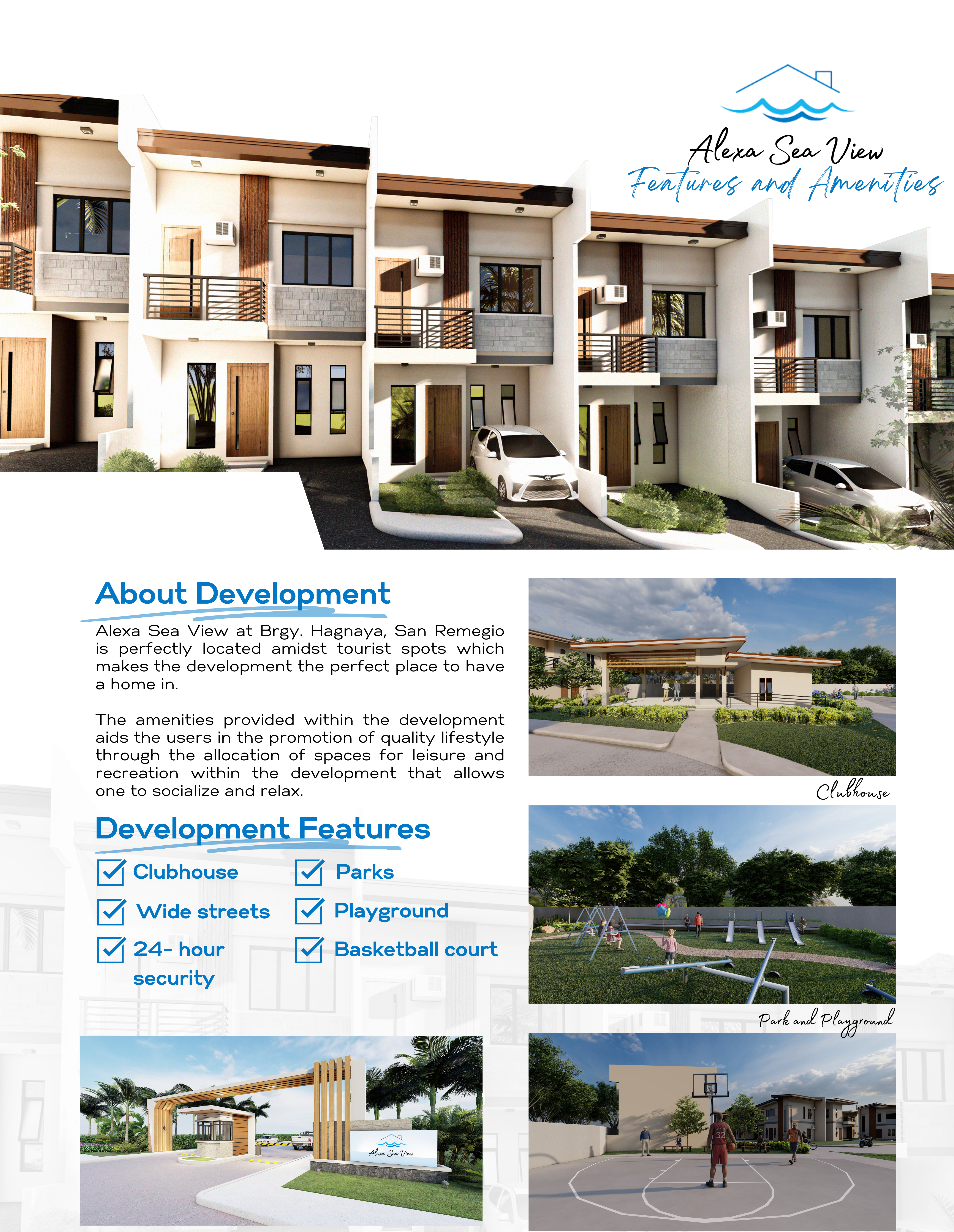 A modern subdivision with quality landscapes surrounded by coconut trees, a clubhouse and basketball court for recreational activities, wide street for biking, a park and playground for kids and family bonding, perimeter fence and concrete road, water and electrical system, and an entrance and exit gate with 24-hour security for safety.